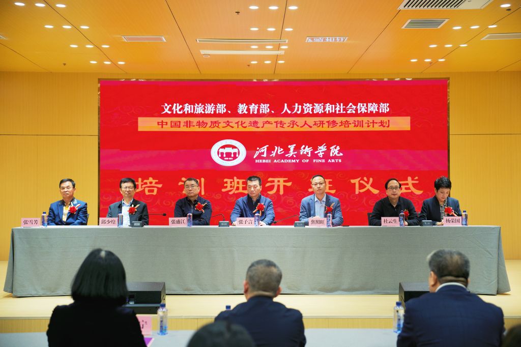 河北省文化和旅游厅非遗处副处长焦照旺,省人社厅职建处处长张盛江,省非遗保护中心书记杜云生,省非遗保护协会副会长兼秘书长张雪芳,新乐市文广旅局局长李立波等省市部门、行业协会嘉宾;河北美术学院副校长张子言,国际学院院长兰新成,设计学院院长董小龙等学校领导;雕刻项目合作单位泉州华光职业学院副理事长邱少煌等出席仪式。仪式由河北美术学院非遗研究中心副主任唐景词主持。