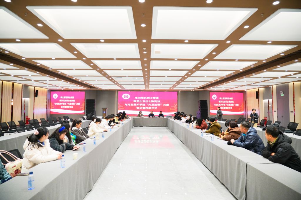 为深入贯彻落实习近平总书记关于“大思政课”的重要指示批示精神,充分激活红色资源育人效能,推动思政教育与实践育人深度融合,11月26日,河北美术学院与华北军区烈士陵园、狼牙山五壮士陈列馆共建“大思政课”实践教学基地签约暨授牌仪式在学校举行。华北军区烈士陵园党委副书记严彩霞、党办室主任王艳红、宣传教育科副科长赵芳婷,狼牙山景区管委会宣传科科长茹林茜、景区市场负责人李红雨,河北美术学院马克思主义学院执行院长梁泽光、党总支书记武笑笑及教师代表参加仪式,见证校馆协同育人新起点。