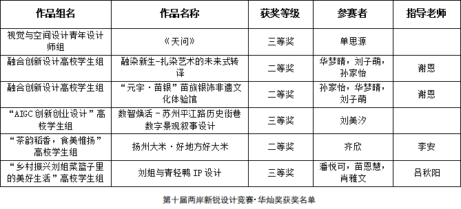 11月25日,第十届两岸新锐设计竞赛・华灿奖国赛获奖名单正式公布。经过校赛遴选、赛区突围、全国网络评审及现场终评的多轮严苛考核,我校师生凭借扎实的专业功底、大胆的创新表达与鲜明的文化辨识度,在来自两岸近千所高校、数万名参赛者的激烈角逐中脱颖而出,喜获二等奖3项、三等奖3项。
