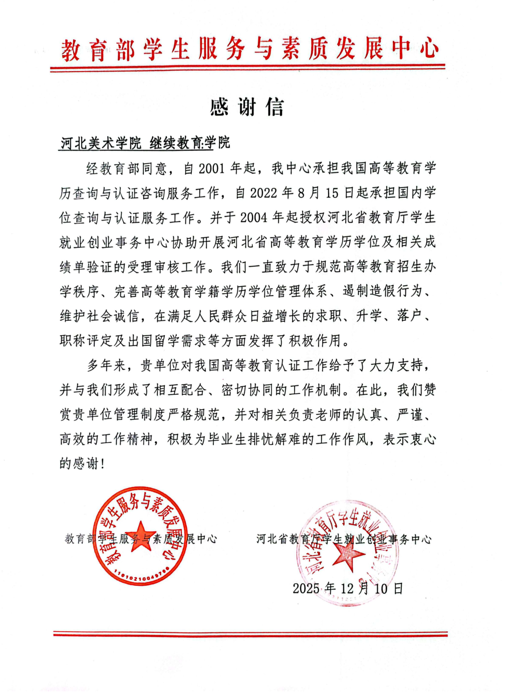 近日,教育部学生服务与素质发展中心、河北省教育厅学生就业创业事务中心向河北美术学院发来感谢信,对学校多年来在我国高等教育学历学位认证工作中给予的宝贵支持与密切协作表示高度肯定和诚挚感谢。