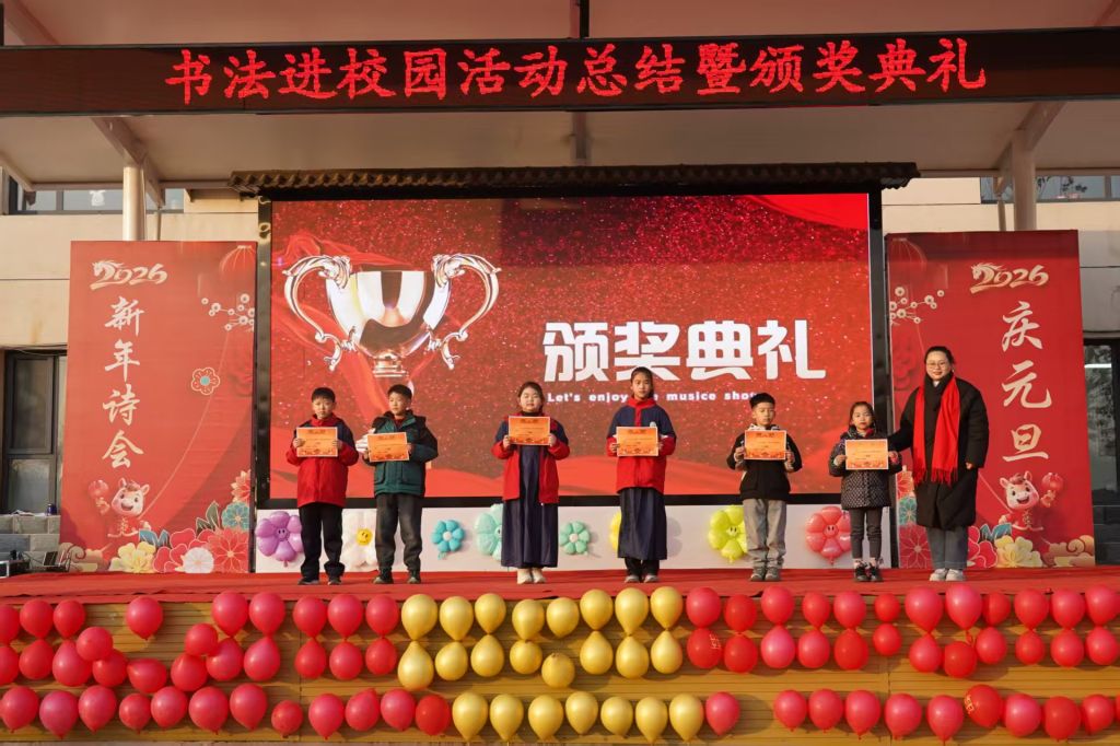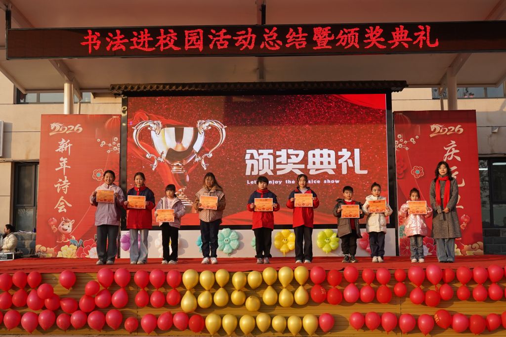 张政良、代晴、赵莲如分别为堽头小学期末书法比赛一、二、三等奖获奖学生颁奖;新乐市堽头小学校长为优秀支教志愿者代表颁发荣誉证书,向他们的辛勤付出致以诚挚谢意。