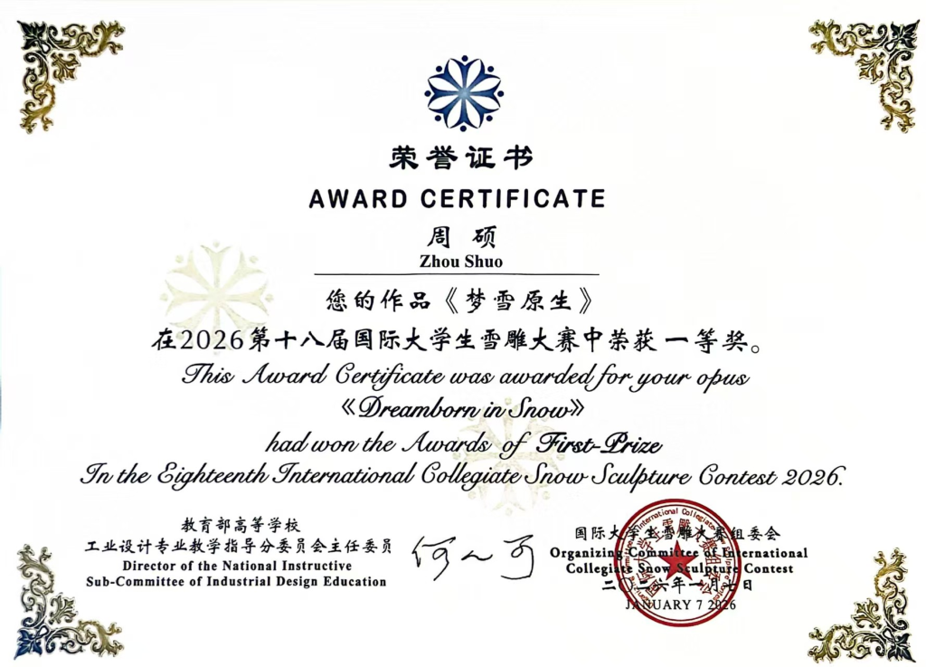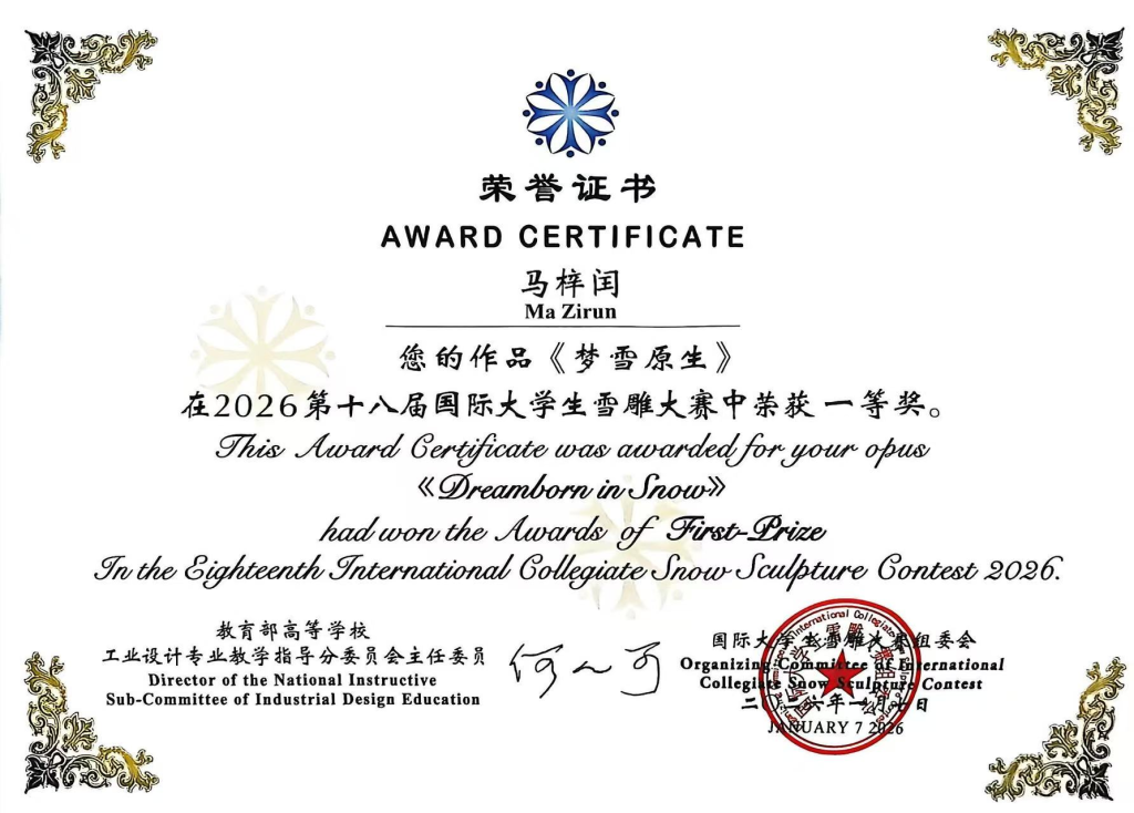 1月7日,由教育部工业设计专业教学指导分委员会主办,哈尔滨工程大学承办的第十八届国际大学生雪雕大赛落下帷幕。我校雕塑与公共艺术学院师生作品《梦雪原生》斩获一等奖。