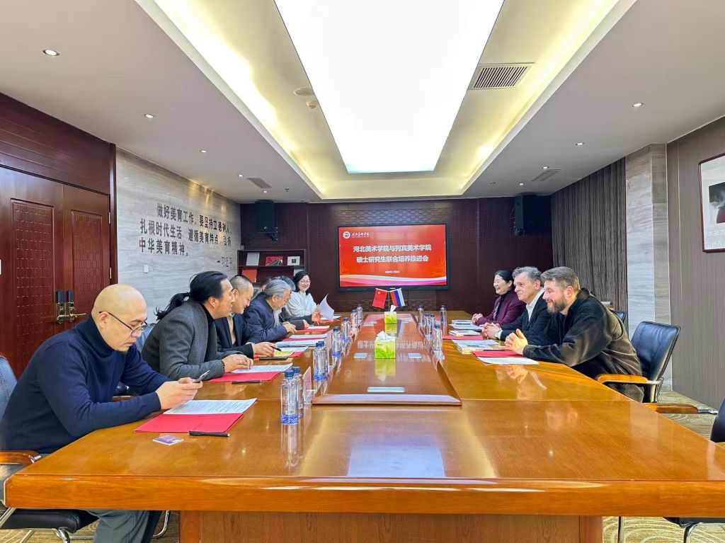 列宾美术学院副校长斯克利亚连科·安德烈、绘画系主任佐尔金・伊利亚、长春大学外国语学院副教授李众志,河北美术学院举办者、校长甄忠义,常务副校长张建敏,国际交流与合作中心主任兰新成,学科办主任张立阳,设计学院副院长陈利伟等参加座谈会。会议由设计学院院长董小龙主持。