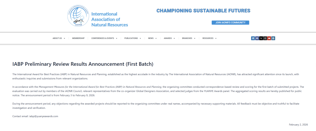 根据国际自然资源学会(iAONR)2026年2月2日官方发布的初评结果公告(中国区),本届评审工作由国际自然资源学会(iAONR)理事会成员牵头,在国际统一评审标准下组织实施,联合Global Designers Association相关代表及评审团专家共同完成。中国区入围项目单位主要为北京大学土地规划与设计研究所、天津大学、哈尔滨工业大学、北京工业大学、河北美术学院、中国建筑设计研究集团、深圳城市规划与土地资源研究中心等高校团队以及一线建筑规划设计院,评审通过通讯评审与综合评分相结合的方式,从多维度进行系统遴选,最终形成提名项目名单并予以公示。