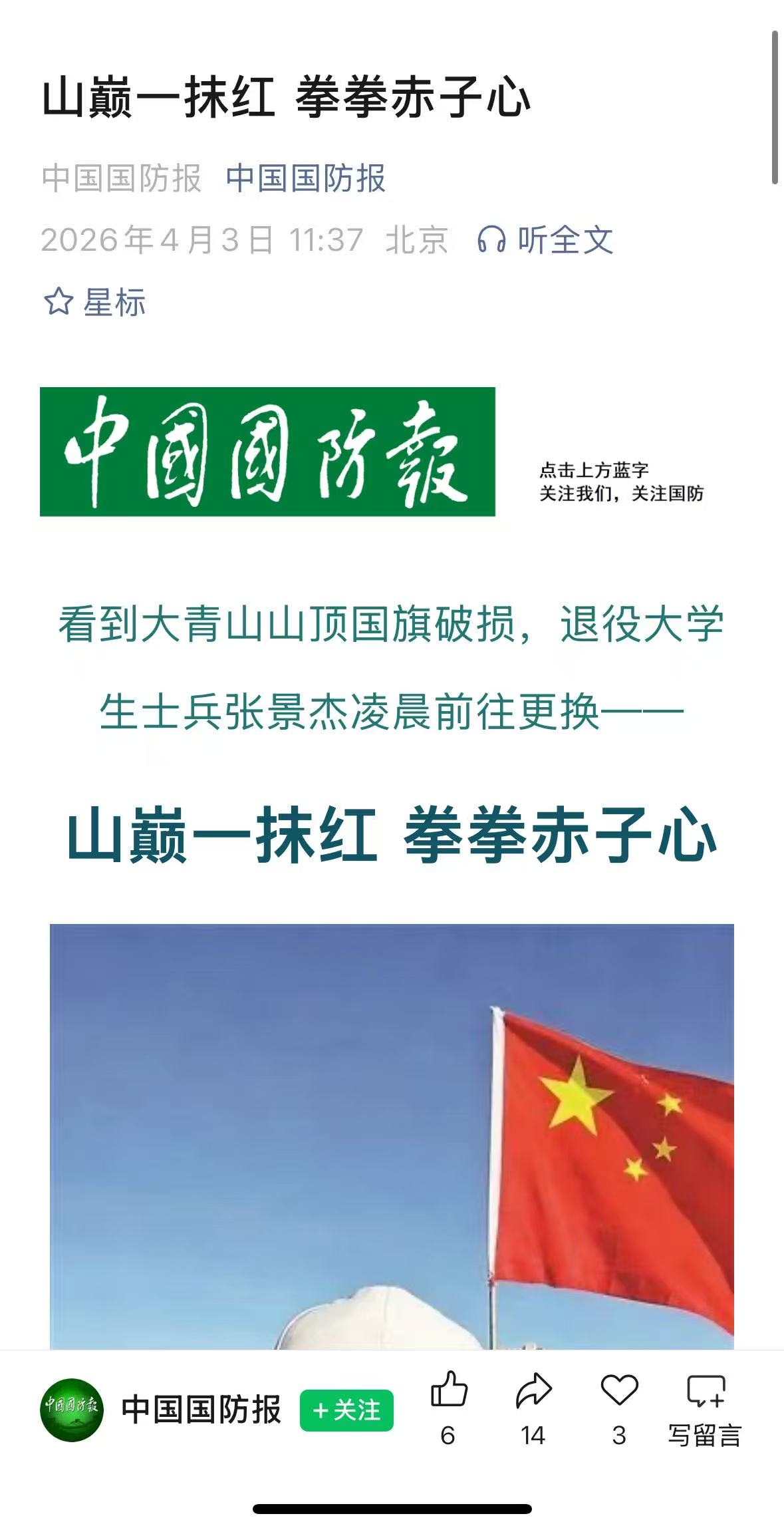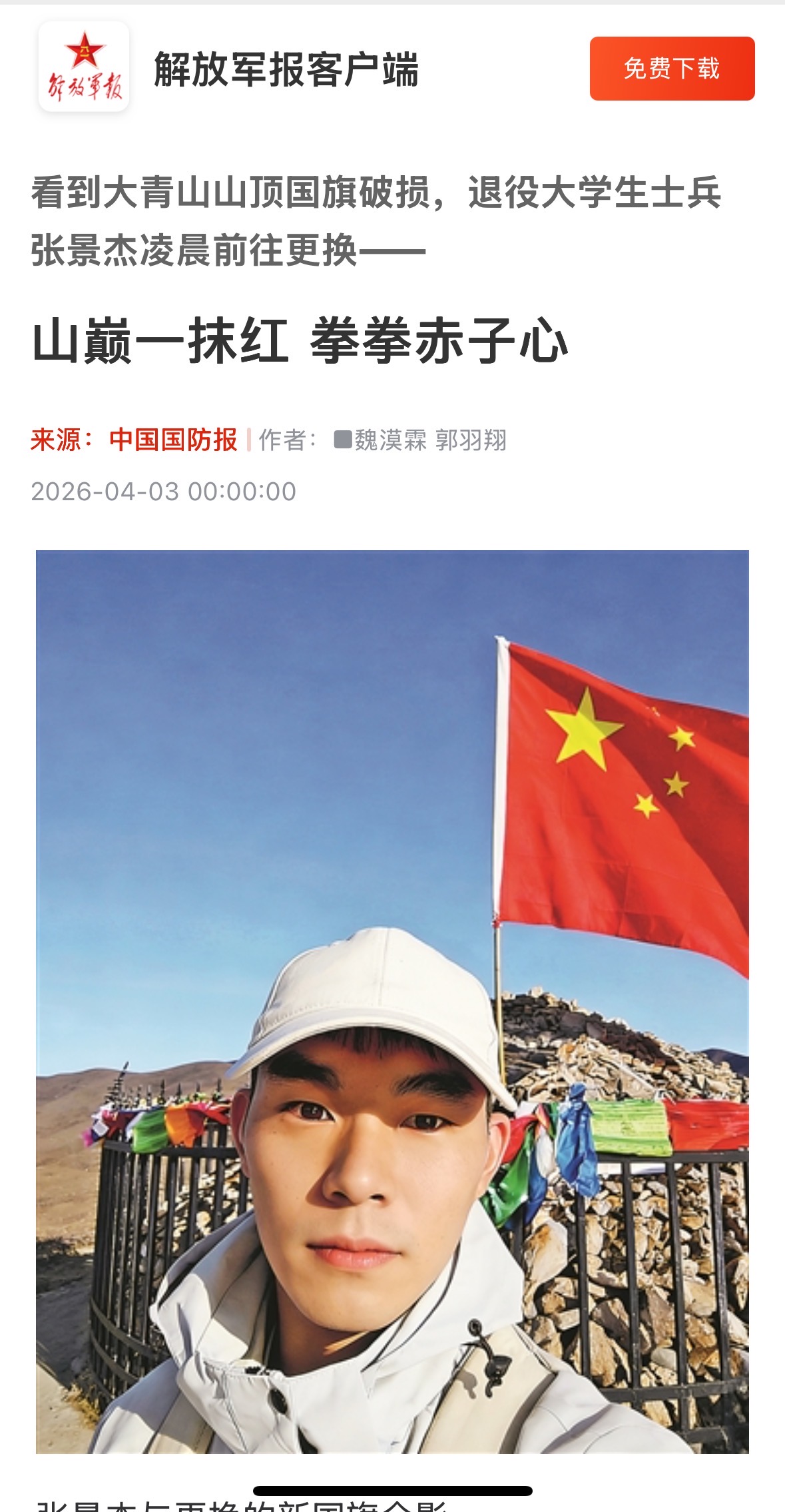 近日,我校水上运动队队员、退役大学生士兵张景杰的感人事迹被《中国国防报》报道。他用一次凌晨登顶大青山更换破损国旗的行动,生动诠释了一名退役军人和新时代大学生的家国情怀与责任担当。