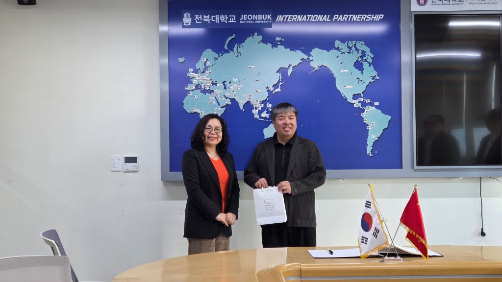 4月8日,代表团到访全北国立大学。该校作为韩国国立旗舰大学之一,其艺术类专业在传统与现代融合方面成果突出。全北国立大学副校长赵花林、老师金印苏、老师全春梅出席会谈。双方就校级领导互访机制、交换生学习项目、夏令营联合组织以及艺术展览合作等进行全面交流。我校提出定期举办两校作品联展的倡议,得到韩方积极响应。双方约定尽快细化国际交换生派遣方案,并推动年内启动首次校级互访与师生作品交流展。
