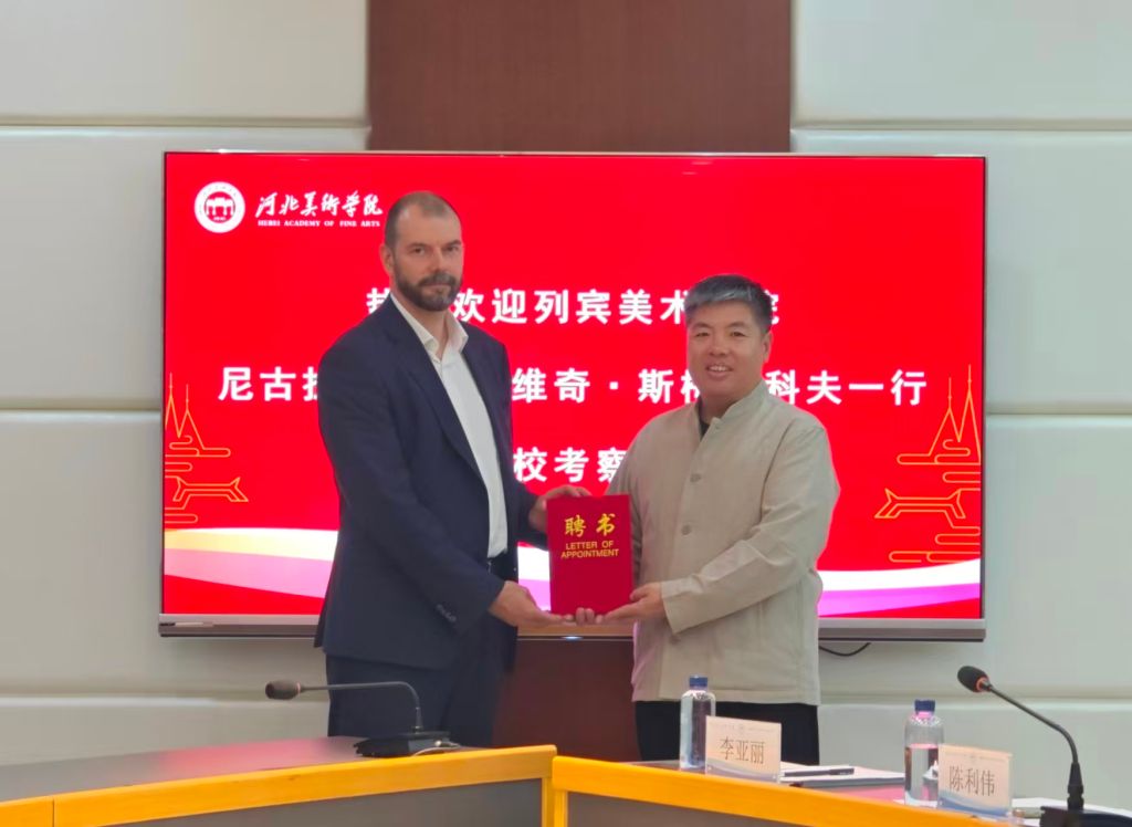 张建敏代表学校向尼古拉·奥列格维奇·斯梅尔科夫颁发河北美术学院客座教授荣誉聘书。