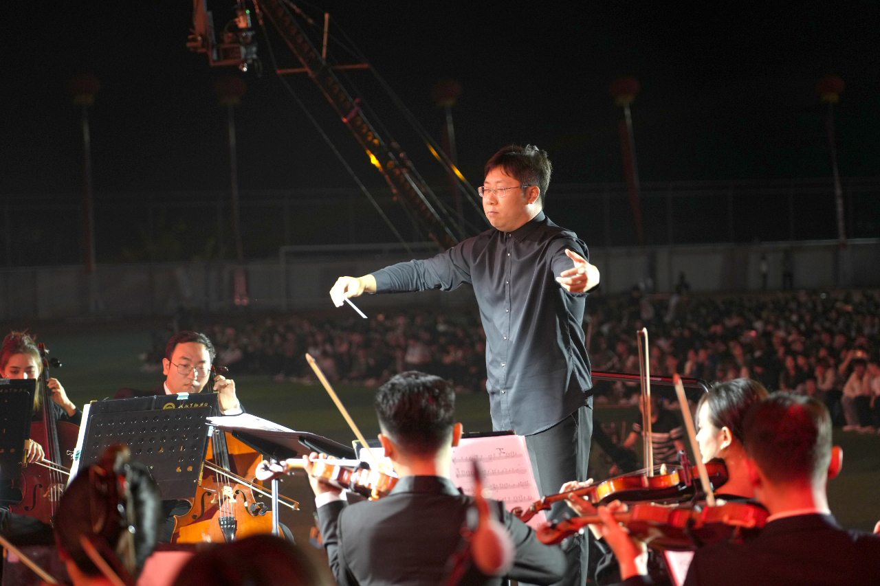音乐会下半场,《炎黄风情》组曲选段以四川民歌《太阳出来喜洋洋》、河北民歌《对花》等为素材,展现中国民俗的鲜活图景;《红色娘子军》组曲通过《序曲》与《快乐的女战士》,再现革命年代的青春活力。终曲《歌唱祖国》由影视艺术学院合唱团与交响乐团联袂呈现,全场观众自发合唱,五星红旗在体育场内飘扬,将爱国情怀推向顶点。