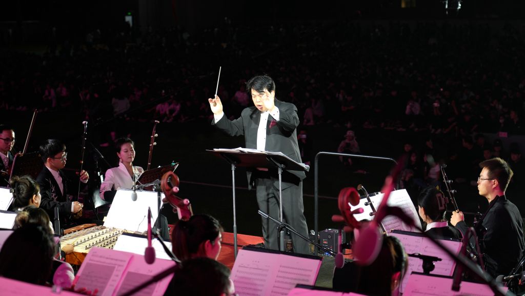 9月24日晚,民族管弦乐专场音乐会以《金蛇狂舞》激昂开场,通过锣鼓与旋律的交织,再现抗战时期中华民族不屈不挠的斗争精神。随后,《印象国乐》以笛箫、弦乐与打击乐的对话,勾勒出从雪域高原到江南水乡的壮美画卷;《云想花想》则借琵琶珠落玉盘般的音色,演绎李白笔下“云想衣裳花想容”的诗意。