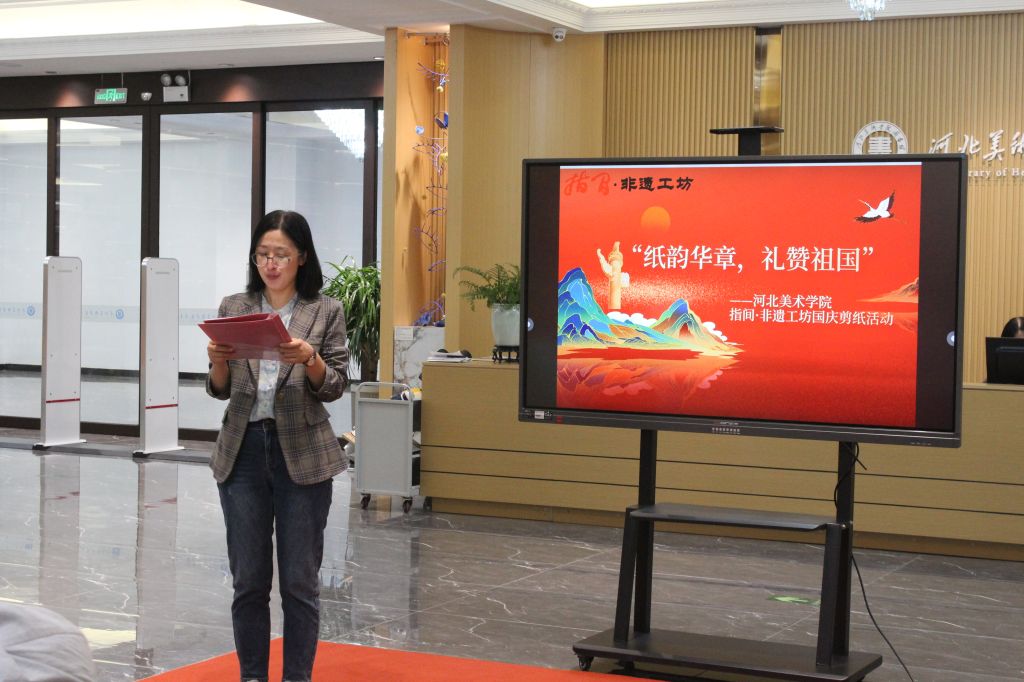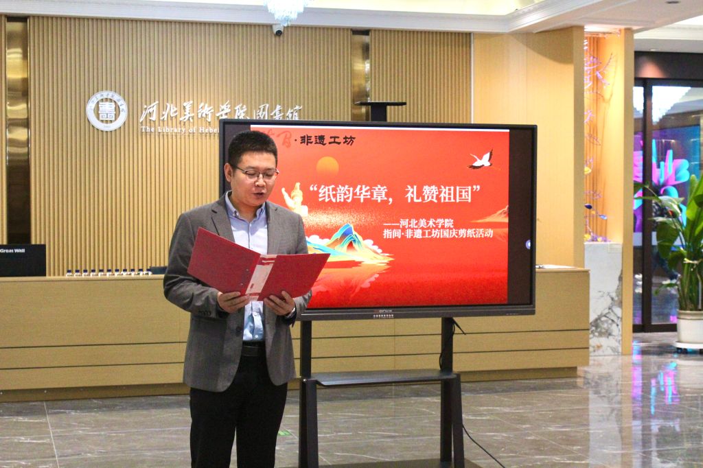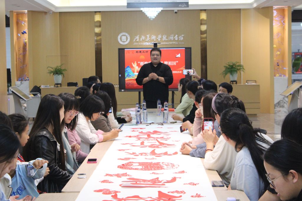 为庆祝中华人民共和国成立76周年,弘扬中华优秀传统文化,9月27日上午,河北美术学院指间·非遗工坊成功举办了“纸韵华章,礼赞祖国”国庆主题剪纸活动。本次活动将非遗技艺与爱国情怀相融合,在方寸红纸间镌刻时代华章,以独特的方式为祖国献上深情祝福。石家庄市民间文艺家协会主席王律一行,行唐剪纸代表性传承人赵成龙,石家庄市青少年书画家协会副会长程英哲,我校设计学院副院长孙文琰,工坊指导老师、设计学院非遗教研室主任唐景词,图书馆老师白莉等参加了本次活动。活动由图书馆馆长李世新主持。