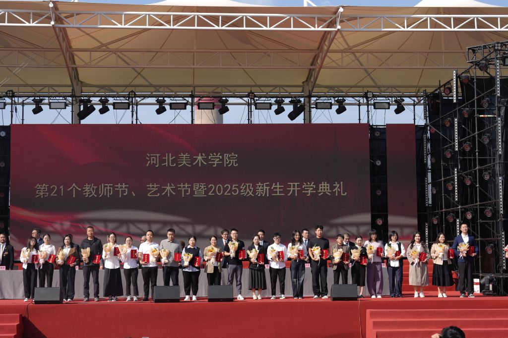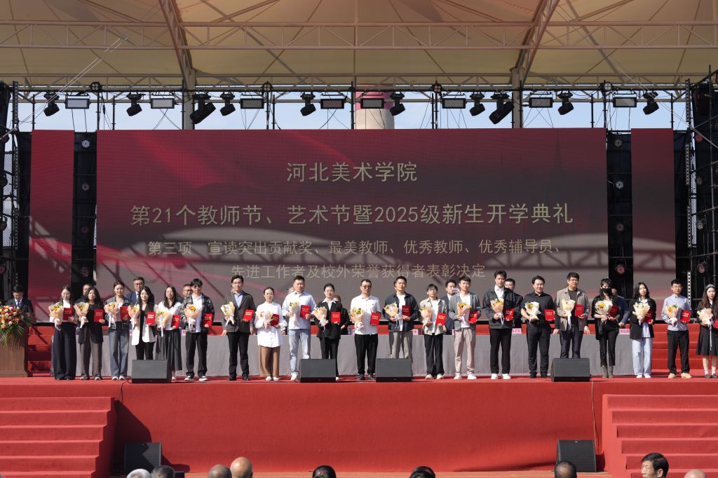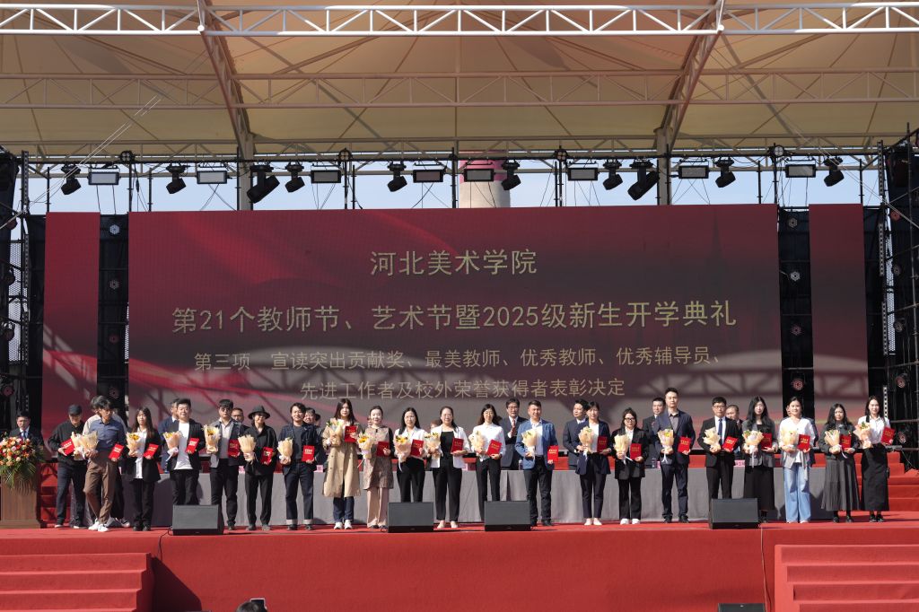 甄墨宣读《河北美术学院关于表彰2024—2025学年突出贡献奖、最美教师、优秀教师、优秀辅导员、先进工作者及校外荣誉获得者的决定》。与会校领导为获奖代表颁发荣誉证书和奖金。