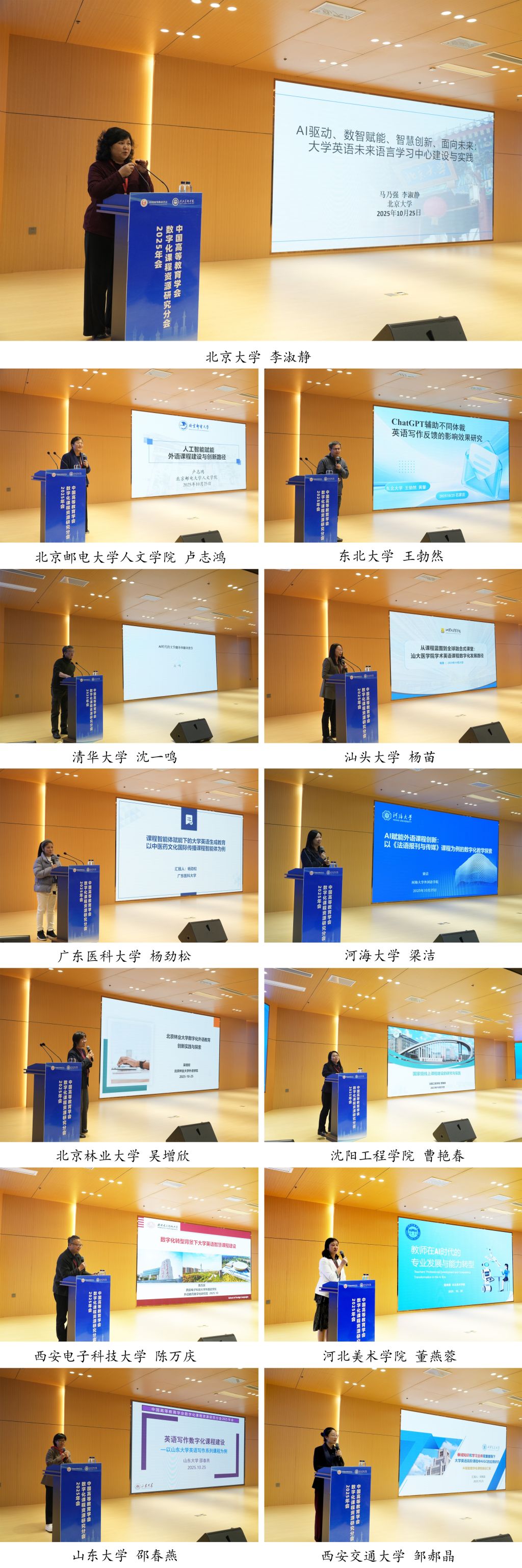 专题报告环节由河北医科大学赵贵旺、中央财经大学王晓红、重庆大学李小辉、东北大学王勃然、暨南大学彭凡、江西环境工程职业学院王婧洁主持。会议安排六个专题,共13场专题报告。北京大学李淑静、北京邮电大学卢志鸿、东北大学王勃然、清华大学沈一鸣、汕头大学杨苗、广东医科大学杨劲松、河海大学梁洁、北京林业大学吴增欣、沈阳工程学院曹艳春、西安电子科技大学陈万庆、河北美术学院董燕蓉、山东大学邵春燕、西安交通大学邹郝晶分别作了题为《大学英语未来语言学习中心建设与实践》《人工智能赋能外语课程建设与创新路径》《ChatGPT辅助不同体裁英语写作反馈的影响效果研究》《AI时代的文学翻译和翻译教学》《从课程蓝图到全球融合式课堂:汕大医学院学术英语课程数字化发展路径》《课程智能体赋能下的大学英语生成教育:以中医药文化国际传播课程智能体为例》《AI赋能外语课程创新:以〈法语报刊与传媒〉课程为例的数字化教学探索》《北京林业大学数字化外语教育的创新实践与探索》《国家级线上课程建设的研究与实践》《数字化转型背景下大学英语智慧课程建设》《教师在AI时代的专业发展与能力转型》《英语写作系列课程的数字化建设》《垂域知识和学习主体双重督导下的大学英语AIGC+高阶课堂》的专题报告。