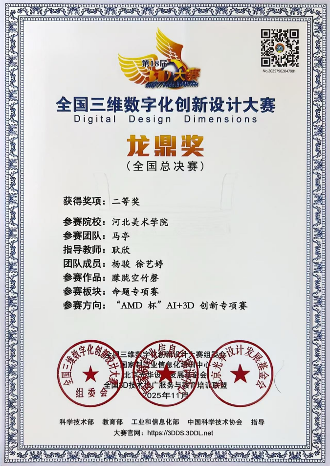 11月16日,第18届全国三维数字化创新设计大赛全国总决赛暨“龙鼎奖”颁奖盛典在北京石油化工学院举行。我校设计学院教师耿欣,带领学生杨骏、徐艺婷组成的参赛团队,凭借作品《“朦胧空竹磬”——空竹虚拟展厅》在“AMD杯”AI+3D创新专项赛道中脱颖而出,成功斩获国家级二等奖。