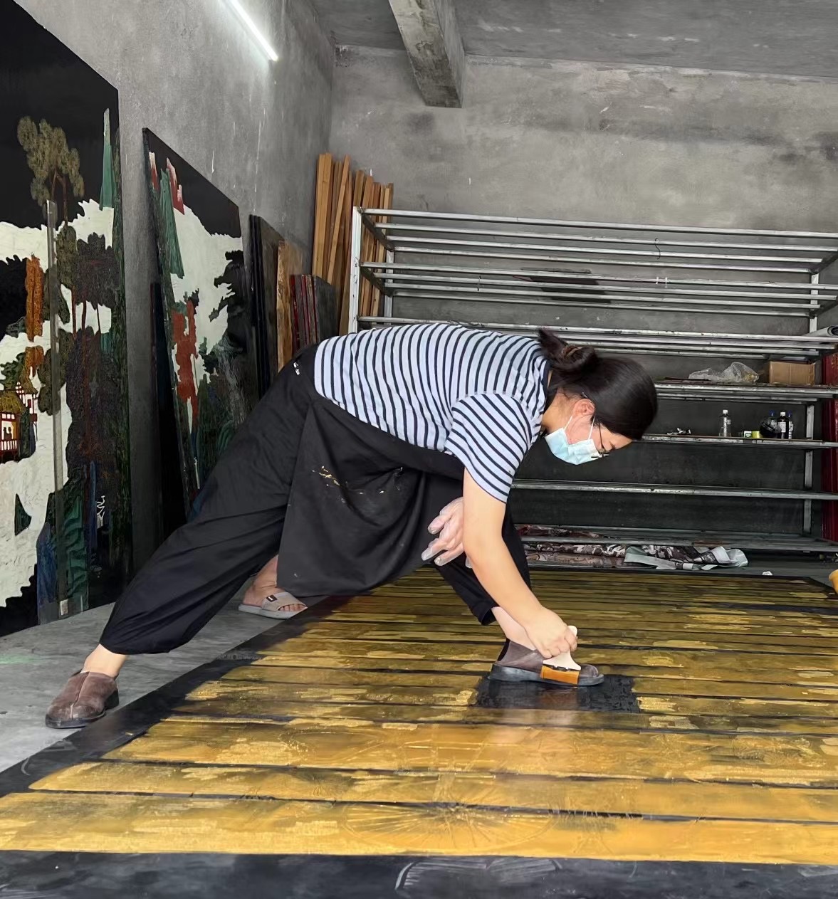 2024年6月,孔老师的漆壁画、综合材料作品相继进入第十四届全国美展初评,最终漆壁画《美育之为》入选全国美展壁画展区。在创作过程中,从搬运、制作图稿、透稿、技法实验、画面调整修改、打磨到抛光等一系列程序,孔老师都认真钻研,全身心投入,积累了丰富的科研创作经验。